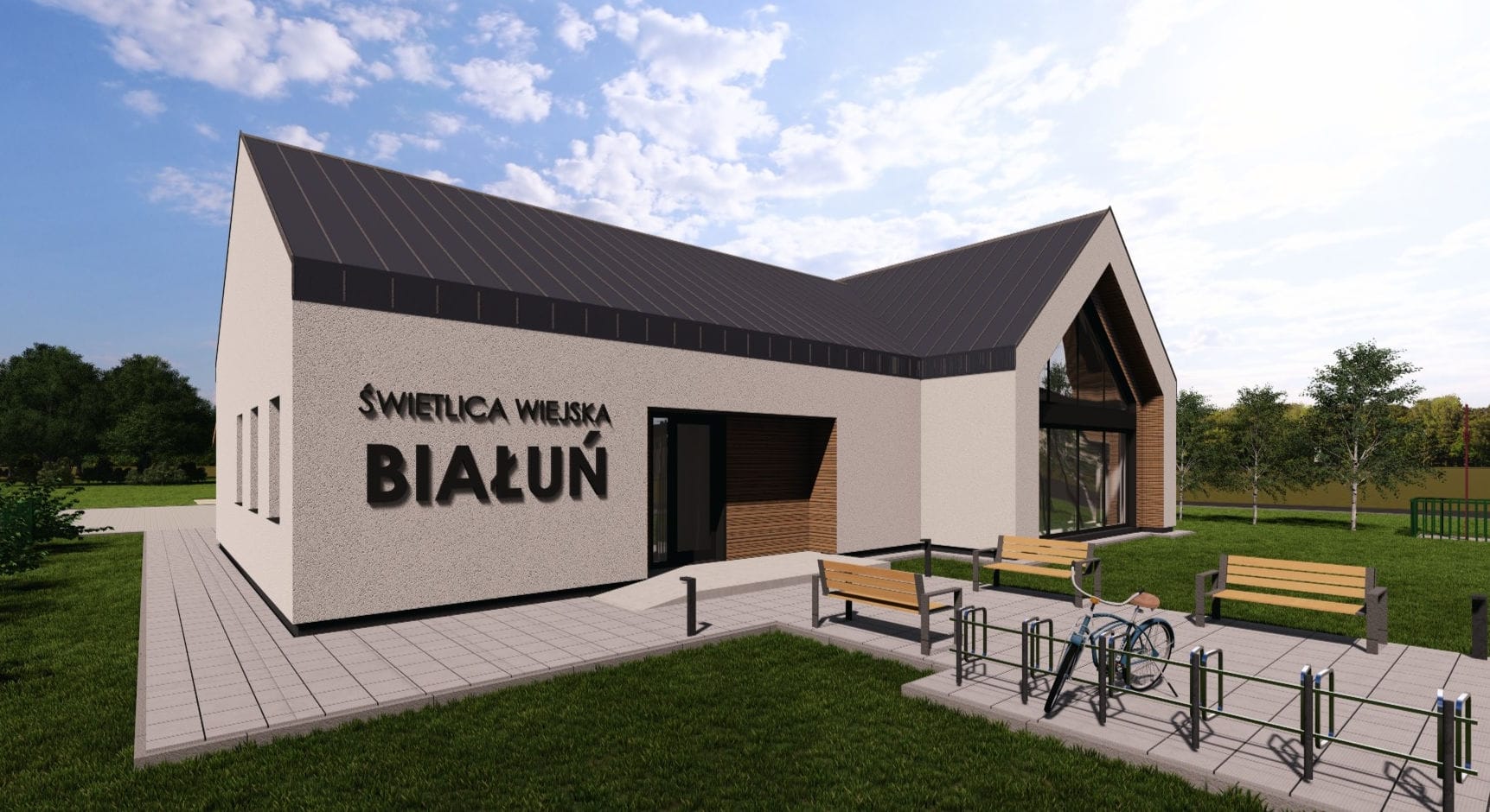 Obraz, który załączamy, to jedna ze wstępnych wizualizacji świetlicy wiejskiej w Białuniu, opracowana przez Pracownię Projektową Arkada ze Szczecina.
