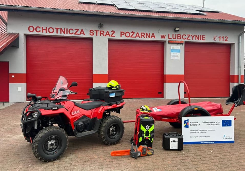Dzięki uzyskanemu dofinansowaniu z Programu Funduszu Europejskich dla Pomorza Zachodniego 2021-2027, Priorytet 2, Fundusze Europejskie na rzecz zielonego Pomorza Zachodniego, Działanie 2.15 Wzmocnienie służb ratownictwa, strażacy z OSP Lubczyna wzbogaciliśmy się o nowy specjalistyczny sprzęt.